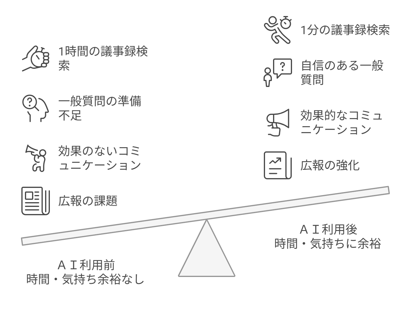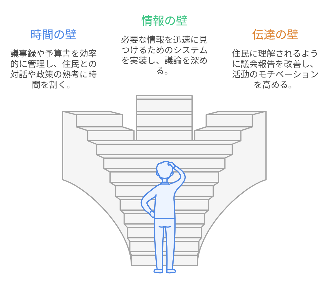 一般質問や委員会での発言には、裏付けとなる正確な情報が不可欠です。しかし、過去の議事録、分厚い総合計画、毎年の予算書…これら全てに目を通し、論点を整理するには、あまりにも時間がかかりすぎます。その結果、本来最も時間を割くべき「住民との対話」や「政策の熟考」が後回しになってはいないでしょうか。