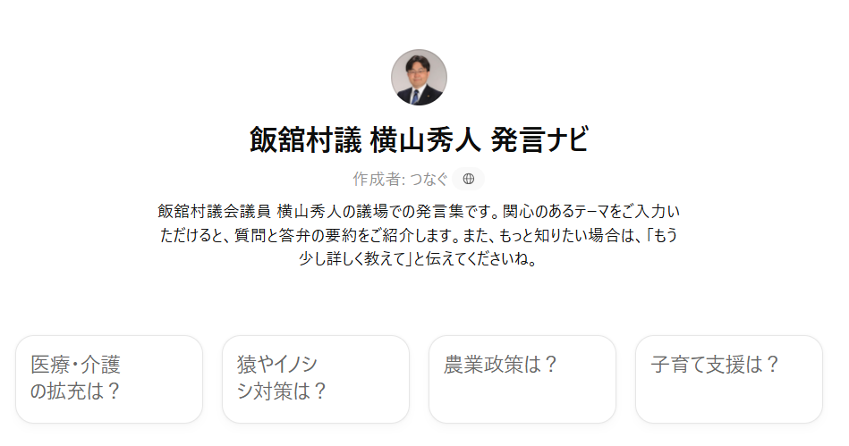 一般質問14回、予算審査4回、決算審査3回分と文量がとても多いので、文書一覧や表形式ではなく、ChatGPTのサービスの一つ議員専用のGPTs「発言集」を作ったほうが柔軟に対応できます。特徴は、村民の方が自由に関心のあるテーマを入れると、発言の要約が表示されます。今後の追加も簡単ですので、継続性もあります。挑戦してみましょう!