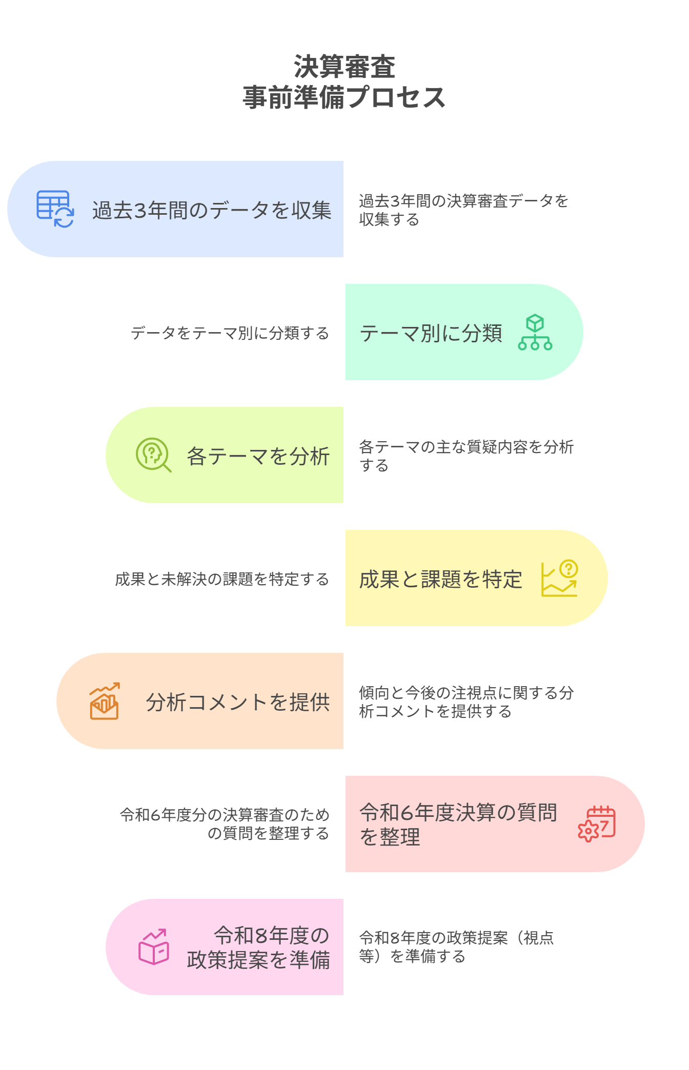 - 要約を用いて令和7年9月の決算審査においての重点項目のリストアップ、また、令和8年度事業への政策提案等を担当がAIに指示し、AIが作成する。